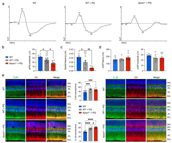 To induce oxidative stress, mice received intraperitoneal (IP) injections of paraquat (PQ) (15 mg/kg, Sigma-Aldrich, St. Louis, MO, USA) in saline solution three times for 1 week as previously described [19]. Measurements for visual function tests (n = 6 to 8 mice per group) such as pattern electroretinogram (pERG), pattern visual evoked potential (pVEP), and virtual optomotor response were assessed 1 week after PQ treatment.