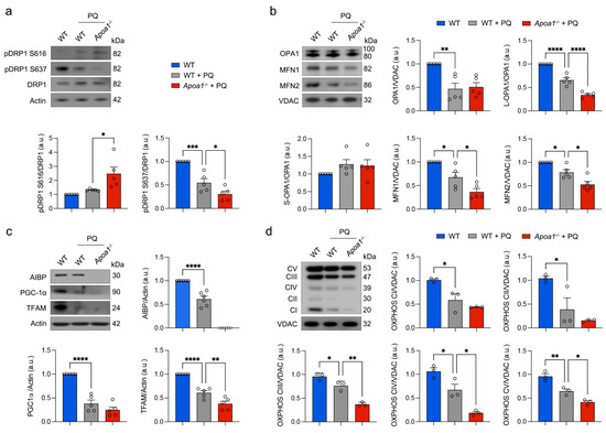 AIBP deficiency compromised mitochondrial structure and function in Müller glia and RGCs in Apoa1bp−/− mice [15]. Given that AIBP deficiency triggered dynamin-related protein 1 (DRP1) dephosphorylation at serine 637 (pDRP1 S637), an indicator of mitochondrial fragmentation, in the Apoa1bp−/− retina [15], we investigated whether oxidative stress intensifies excessive mitochondrial fragmentation-mediated mitochondrial impairment in 10-month-old WT and Apoa1bp−/− retinas by measuring the phosphorylation of glycogen synthase kinase 3β (GSK3β), DRP1 at serine 616 (S616), and DRP1 S637. GSK3β is a protein kinase that directly or indirectly regulates the phosphorylation of DRP1 S616 and S637 [27,28]. We observed a significant increase in pDRP1 S616 but a significant decrease in pDRP1 S637 in the Apoa1bp−/− retina compared with the WT retina under the conditions of oxidative stress (Figure 2a; Supplementary Figure S2a). In the presence of oxidative stress, GSK3β activation was significantly enhanced in the WT retina due to GSK3β dephosphorylation (Supplementary Figure S2b). Furthermore, oxidative stress further intensified GSK3β dephosphorylation in the Apoa1bp−/− retina (Supplementary Figure S2b). Based on our findings of the reduced protein expression of optic atrophy type 1 (OPA1) and MFN2, mitochondrial fusion proteins, in the Apoa1bp−/− retina [15], we tested whether oxidative stress exacerbated the impairment of mitochondrial fusion activity in the Apoa1bp−/− retina by measuring OPA1, MFN1, and MFN2 protein expression. Under the conditions of oxidative stress, OPA1, MFN1, and MFN2 protein expressions were significantly decreased in the WT retina. AIBP deficiency further exacerbated the loss of OPA1, MFN1, and 2 protein expression in the Apoa1bp−/− retina compared with WT treated with PQ (Figure 2b). Under oxidative stress conditions, the expression of OPA1, MFN1, and MFN2 proteins was significantly reduced in the WT retina. In Apoa1bp−/− mice, this loss of OPA1, MFN1, and MFN2 expression in the retina was further aggravated compared to the PQ-treated WT retina (Figure 2b). Additionally, we observed a significant decrease in the long isoform of OPA1 (L-OPA1), which is mainly responsible for mitochondrial fusion, following a similar trend to total OPA1. In contrast, the short isoform of OPA1 (S-OPA1), associated with mitochondrial fission, remained unchanged. Based on our observation of a deteriorating mitochondrial network under the conditions of oxidative stress combined with AIBP deficiency, we further assessed whether OXPHOS function and mitochondrial biogenesis are compromised in the context of oxidative stress and AIBP deficiency. In PQ-treated WT mice, there was a significant decrease in the OXPHOS complex, as well as peroxisome proliferator-activated receptor-gamma coactivator 1α (PGC-1α) and mitochondrial transcription factor A (TFAM) protein expression in the retina, which were all further significantly reduced in PQ-treated Apoa1bp−/− mice (Figure 2c,d).