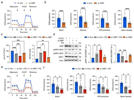 We then examined whether AIBP knockdown compromises mitochondrial respiratory function in rMC-1 cells by AIBP knockdown and Seahorse analysis. We observed a significant reduction in basal and maximal respiration, along with decreases in ATP-linked production and spare respiratory capacity in rMC-1 cells with AIBP knockdown (Figure 3a,b; Supplementary Figure S4). Subsequently, we determined the impact of oxidative stress on the impairment of MMP, a crucial factor for energy production in mitochondria, and an increase in ROS production in rMC-1 cells with AIBP deficiency. Remarkably, oxidative stress further exacerbated the reduction in MMP and the generation of ROS in rMC-1 cells with AIBP knockdown (Figure 3c; Supplementary Figure S4). Given that oxidative stress, in conjunction with AIBP knockdown, exacerbated impaired mitochondrial dynamics by increasing pDRP1 S616 and decreasing pDRP1 S637 in the retina, we then determined how oxidative stress intensifies the deregulation of mitochondrial dynamics in rMC-1 cells with AIBP knockdown. Notably, rMC-1 cells with AIBP knockdown showed a significant increase in pDRP1 S616 but a decrease in pDRP1 S637 in response to oxidative stress (Figure 3d; Supplementary Figure S4), indicating the induction of extensive mitochondrial fragmentation. Lastly, we explored the impact of oxidative stress with AIBP knockdown on mitochondrial respiratory function in rMC-1 cells. Importantly, oxidative stress triggered a significant reduction in all respiratory activities, including basal and maximal respiration, ATP-linked production, and spare respiratory capacity, in rMC-1 cells with AIBP knockdown compared with control rMC-1 cells treated with PQ (Figure 3e,f).