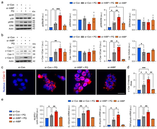 Given that mitogen-activated protein kinase (MAPK)-associated signaling pathways are linked to oxidative stress in Müller glial cells from glaucomatous human and mouse retinas [14,15], we tested the impact of oxidative stress on MAPK (p38 and ERK1/2) activation and apoptotic cell death in rMC-1 cells lacking AIBP. Oxidative stress significantly intensified the activation of p38 and ERK1/2 by increasing the phosphorylation of p38 (pp38) and ERK1/2 (pERK1/2) in rMC-1cells with AIBP knockdown (Figure 4a). We then examined whether oxidative stress exacerbates caspase-mediated apoptotic cell death in rMC-1 cells lacking AIBP. We observed that oxidative stress intensified the activation of caspase-1 and -3, along with increasing caspase-3 immunoreactivity, in rMC-1 cells with AIBP knockdown (Figure 4b–d), indicating an increased activation of caspase-3-mediated apoptotic cell death. The inflammasome is activated by various stimuli, including oxidative stress, leading to the activation of caspase-3 and the regulation of inflammatory responses [31]. In parallel, we found that oxidative stress exacerbated NLRP3-mediated inflammasome activation and increased the mRNA expression of the inflammatory cytokines IL-1β, IL-6, and TNF-α (Figure 4e).