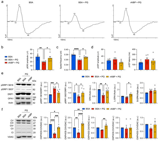Administration of rAIBP prevents visual dysfunction, restores mitochondrial dynamics, and enhances OXPHOS activity in retina. (a) Representative graphs of total recordings of pERG analysis among groups. (b) Quantification analysis of pERG test among groups. N = 6 mice. (c) Quantification analysis of optomotor response among groups. N = 6 mice. (d) Quantification analysis of pVEP tests among groups. N = 6 mice. (e) OPA1, total DRP1, phospho-DRP S616, and phospho-DRP1 S637 expression in retina. N = 3 mice. (f) OXPHOS complex expression in retina. N = 3 mice. Error bars represent SEM. Statistical significance was determined using one-way ANOVA test. * p < 0.05; ** p < 0.01; *** p < 0.001; **** p < 0.0001. BSA, bovine serum albumin; PQ, paraquat; pERG, pattern electroretinogram; pVEP, pattern visual evoked potential.
