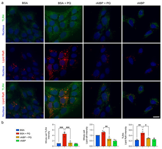 Administration of rAIBP reduced TLR4-associated lipid rafts in Müller glia exposed to oxidative stress. (a) Representative images of TLR4 (green)-LR (red) immunoreactivity (red). Scale bar: 10 μm. (b) Quantitative fluorescent intensity of TLR4-LR immunoreactivity in rMC-1 cells. a. N = 3 independent experiments. Scale bar: 10 μm. Error bars represent SEM. Statistical significance was determined using one-way ANOVA test. * p < 0.05; ** p < 0.01; *** p < 0.001. LR, lipid raft; PQ, paraquat; BSA, bovine serum albumin.