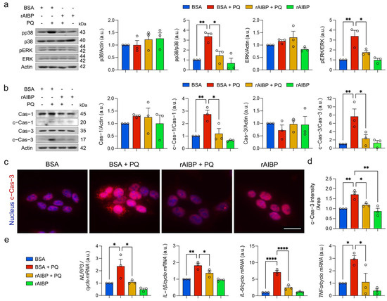 Administration of rAIBP inhibits MAPK activation, apoptotic cell death, and inflammatory response in Müller glia exposed to oxidative stress. (a) p38, phospho-p38 9 (pp38), ERK1/2, phospho-ERK1/2 (pERK1/2) expression in rMC-1 cells. N = 3 independent experiments. (b) caspase-1, cleaved caspase-1, caspase-3, and cleaved caspase-3 expression in rMC-1 cells. N = 3 independent experiments. (c) Representative images show cleaved caspase-3-positive rMC-1 cells. (d) Note that quantification analysis showed significant decrease in cleaved caspase-3 immunoreactive intensity in rMC-1 cells with rAIBP treatment compared with BSA-treated cells under oxidative stress. N = 3 independent experiments. (e) Quantitative real-time PCR analysis of Nlrp3, Il-1β, Il-6, and Tnfα mRNA expression in rMC-1 cells. Error bars represent SEM. Statistical significance was determined using one-way ANOVA test. * p < 0.05; ** p < 0.01; **** p < 0.0001. PQ, paraquat; BSA, bovine serum albumin.