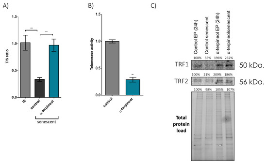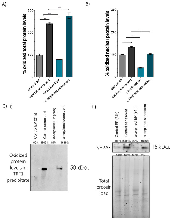To further investigate the potential antioxidant actions of α-terpineol, next, we assessed the levels of oxidized proteins in both early-passage and senescent cells treated with either α-terpineol or the solvent (control). As shown in Figure 5 regarding total proteins, no differences were observed between cells treated with the compound and control; in both cases, oxidized proteins doubled during senescence. However, when examining nuclear proteins, α-terpineol exhibited prominent antioxidant effects in both early-passage (−58%) and senescent (−30%) cells (see Figure 5B). Notably, α-terpineol significantly reduced the levels of oxidized TRF1 in senescent cells compared to their respective control cultures (Figure 5C). These findings strongly indicate that α-terpineol selectively exerts its antioxidant effects within the nuclear environment.