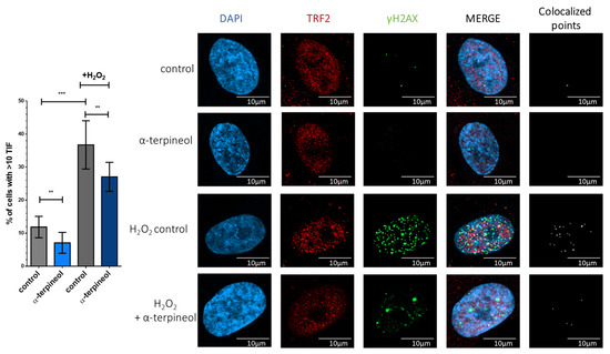 Preserving DNA integrity from oxidative damage holds particular significance in telomeric regions, where maintaining genomic stability is critical for preventing senescence. To identify oxidative damage within telomeric regions, also known as telomere dysfunction-induced foci (TIFs), we examined the co-localization of the DNA damage marker γH2AX with TRF2. Our analysis, presented in Figure 4, revealed that, even in cells not exposed to exogenous oxidative stress, α-terpineol reduced the percentage of cells exhibiting TIFs from 11.9 ± 1.0% to 7.1 ± 1.0%. Similarly, α-terpineol shielded telomeric regions from oxidative damage. Specifically, treatment with H2O2 increased the percentage of cells exhibiting TIFs to 36.7%, while only 27.1% of α-terpineol-treated cells showed TIFs. Therefore, α-terpineol emerges as a promising candidate for safeguarding DNA integrity within telomeric regions against oxidative stress.