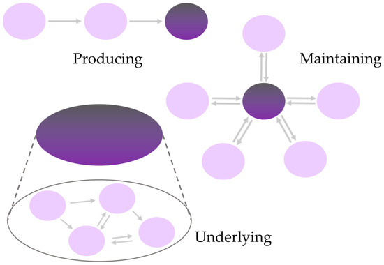 The three different types of mechanisms according to the new mechanist philosophy of science. A producing mechanism describes a cause-effect relationship within a defined level of complexity. A maintaining mechanism explains how a system’s stable state or continuous behavior is sustained. An underlying mechanism spans at least two levels of complexity, providing an inter-level, constitutive explanation. Depending on the focus of the analysis, a combination of these three types of mechanisms may be employed.