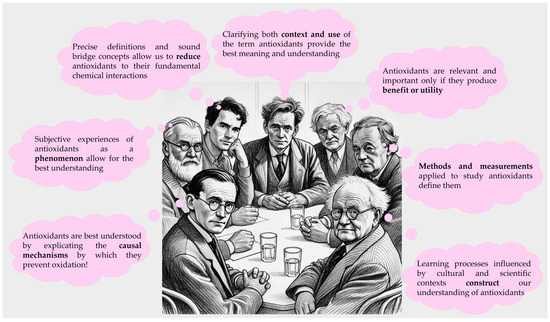 Different philosophical perspectives on the interpretation of the concept of antioxidants are presented from left to right: Carl Hempel would view antioxidants from the perspective of mechanisms and causality, Edmund Husserl would focus on phenomenology and subjective experience, Ernest Nagel would emphasize reductionism with precise definitions, Ludwig Wittgenstein would call for the clarification of use and context, Richard Rorty would inquire about their utility and benefit from a pragmatist viewpoint, Percy Williams Bridgman would define antioxidants through methods and measurements, and Jean Piaget would appreciate antioxidants as constructs of learning processes. (The figure is partially generated by ChatGPT, a language model developed by OpenAI).