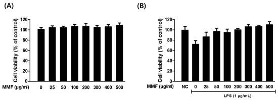 The cytotoxic effect of MMF on the viability of RAW264.7 cells was examined using the WST assay. The RAW264.7 cells were incubated with various concentrations (0–500 μg/mL) of MMF for 24 h. No significant decrease in cell viability was observed, even at the highest concentration of MMF (Figure 2A). On the other hand, the MMF treatment dose-dependently restored the cell viability reduced by LPS (1 μg/mL) from 71.95% to 109.75% (Figure 2B). Subsequent experiments were conducted using MMF at 300 or 500 μg/mL.