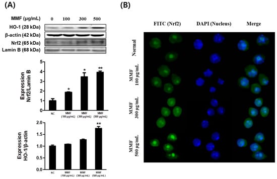 The antioxidant effects of MMF on the Nrf2/HO-1 signaling pathway were investigated by western blotting. MMF dose-dependently increased HO-1 expression, and significant nuclear translocation of Nrf2 was observed at 500 μg/mL (Figure 3A). The nuclear translocation of Nrf2 was reconfirmed through immunofluorescence microscopy. MMF dose-dependently increased the nuclear translocation of Nrf2 (Figure 3B).