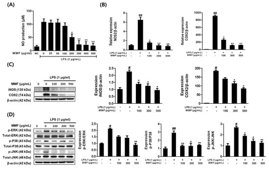 The effects of MMF on NO production in LPS-stimulated RAW264.7 cells were evaluated. The NO levels in the medium significantly increased by LPS at 1 μg/mL for 24 h. MMF significantly and dose-dependently reduced NO production in LPS-stimulated RAW264.7 cells. At 500 μg/mL, MMF significantly decreased LPS-induced NO production from 107.66 to 17.84 μM in RAW264.7 cells (Figure 4A). The effects of MMF on the mRNA and protein expression levels of iNOS and COX2 in LPS-stimulated RAW264.7 cells were examined. The change in iNOS protein in relation to NO production was observed. MMF notably and dose-dependently inhibited the LPS-induced mRNA and protein expression levels of iNOS and COX2 in RAW264.7 cells (Figure 4B,C). The inhibitory effects of MMF on the MAPK signaling pathway in LPS-stimulated RAW264.7 cells were investigated by western blotting. LPS markedly elevated the phosphorylation level of ERK, JNK, and p38. On the other hand, high MMF concentrations significantly inhibited the phosphorylation of ERK, JNK, and p38 in LPS-stimulated RAW264.7 cells (Figure 4D).