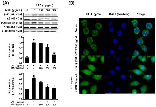 MMF inhibited NFκB translocation by reducing the phosphorylation of IκB in RAW264.7 macrophages. RAW264.7 macrophages were co-treated with MMF and LPS (1 μg/mL) for 12 h. (A) Relative phosphorylation of the IκB and NFκB protein levels as determined by western blot analysis. (B) visualized by immunofluorescence microscopy. The results are presented as the means ± SDs of three independent experiments. # p < 0.05 versus LPS-treated controls, and * p < 0.05, ** p < 0.01 versus LPS-treated RAW264.7 cells.