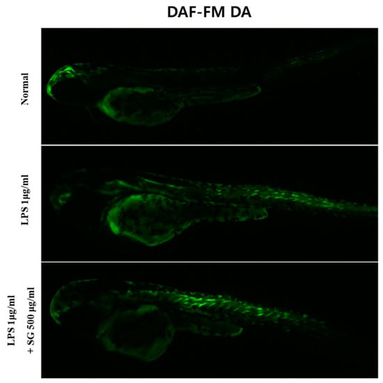 The inhibitory effects of MMF on NO production in LPS-induced zebrafish larvae were evaluated using the fluorescent probe DAF-FM DA. The LPS treatment induced NO production in zebrafish larvae, and MMF reduced this LPS-induced increase in NO production (Figure 7).