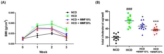 Assessment of the BMI and plasma total cholesterol in adult zebrafish fed MMF. (A) Change in BMI (g/cm2) during the experimental period for three weeks. (B) TC levels in HCD-induced obese zebrafish at three weeks fed 10% and 20% MMF + HCD. NCD: normal cholesterol diet; HCD: high-cholesterol diet. * p < 0.05, *** p < 0.001, ### p < 0.001.
