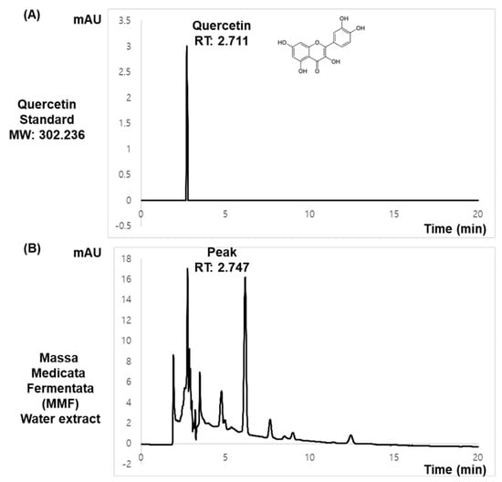 The HPLC analysis was performed with MMF extract and previously known ingredients of MMF. HPLC chromatogram showed a peak of an identified standard compound of quercetin at a retention time of 2.711 min (Figure 9A). This peak corresponded to the peak in MMF used in this study at a retention time of 2.747 min (Figure 9B). We estimated the concentration of quercetin contents in MMF extract as 891.9 μg/g (w/w) based on the standard curve quantification.