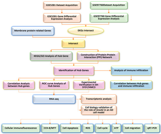 In this study, we extracted gene expression profiles from the GSE5281 and GSE97760 microarray datasets in the GEO database, as well as from the Human Gene (HG) Database, to identify gene biomarkers associated with AD. Through detailed analyses, AnxA2 was identified as a putative target gene. Subsequently, transcriptomic analysis and a series of cell biology experiments were conducted to explore the pathophysiological role of AnxA2 in AD (Figure 1). Interestingly, within the annexin family, AnxA1 acts as an anti-inflammatory molecule, participating in Aβ42 clearance by activating neprilysin and regulating the RhoA-ROCK signaling pathway [38], in contrast, AnxA2, in addition to its role as an anti-inflammatory molecule, is also involved in the pro-inflammatory response mediated by tissue plasminogen activator (tPA) [39]. AnxA2 knockout mice exhibit increased levels of proinflammatory cytokines, such as TNF-α, following traumatic brain injury (TBI) due to reduced inflammasome activation [40]. Moreover, AnxA2 may promote the release of inflammatory factors and the migration of inflammatory cells by interacting with lipids and proteins on the cell membrane, thereby participating in the inflammatory response [39]. The absence of AnxA2 exacerbates the pro-inflammatory response through IL-17 signaling [41]. Studies have also shown that AnxA2 plays a crucial regulatory role in oxidative stress processes; it can maintain intracellular redox balance by modulating the generation and clearance of ROS, thereby protecting cells from oxidative stress damage [42]. In AD, Aβ accumulation leads to increased ROS production, triggering oxidative stress, which further exacerbates neuronal injury and death. Additionally, AnxA2 is implicated in autophagy, where it binds to presenilin 1 (PS1) phosphorylated at the Ser367 site, facilitating autophagosome-lysosome fusion and reducing Aβ42 accumulation by increasing the degradation of amyloid precursor protein-β-C-terminal fragment through autophagy [43]. Furthermore, double immunofluorescence staining confirmed elevated AnxA2 expression in astrocytes and neurons [44,45]. Similar to AnxA1, AnxA2 translocates to membrane-associated partners, such as EGFR, and is linked to enhanced disease pathogenicity. In summary, the precise role of AnxA2 in AD remains unclear. Here, we employed molecular and cellular biology techniques to analyze the effects of AnxA2 gene silencing on inflammation, apoptosis, oxidative stress, and autophagy. These findings contribute to a better understanding of the role of annexins and vesicular transport in AD pathophysiology and provide insights into the potential of AnxA2 as a therapeutic target.