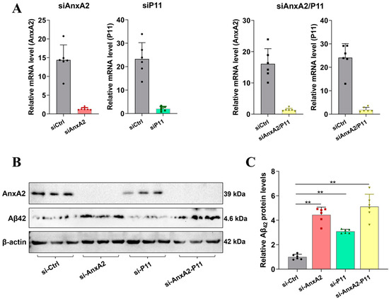 Establishment and validation of AnxA2 gene-knockdown SH-SY5Y cells. (A) qRT-PCR validation of AnxA2 and P11 mRNA expression in SH-SY5Y cells treated with siAnxA2; (B) Western blotting analysis of AnxA2 and Aβ42 protein expression; (C) Semi-quantitation of the expression of the proteins. Data are presented as mean ± SEM. ** p < 0.01, determined by one-way ANOVA followed by Tukey–Kramer test for multiple comparisons, n = 6.