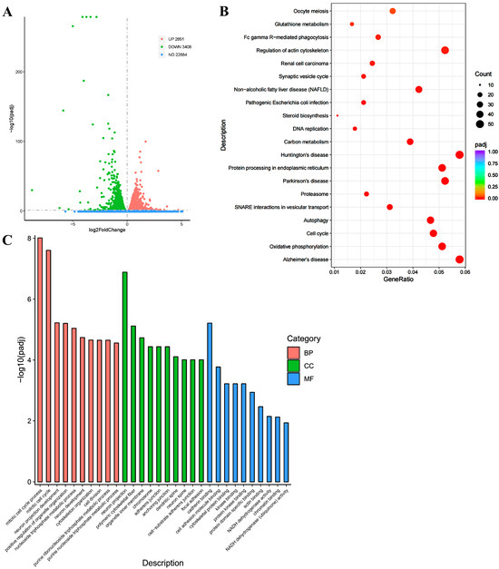 Transcriptomic analysis of differential expression of genes in siAnxA2 treated and non-treated SY-SY5Y cells that secret Aβ42. (A) Volcano map of DEGs. The green dots represent upregulated gene transcription, the red dots indicate downregulated transcription, and the blue dots represent nonsignificant transcription. (B) KEGG enrichment analysis. (C) GO enrichment analysis in the biological process (BP), cellular component (CC), and Molecular function (MF) domains.