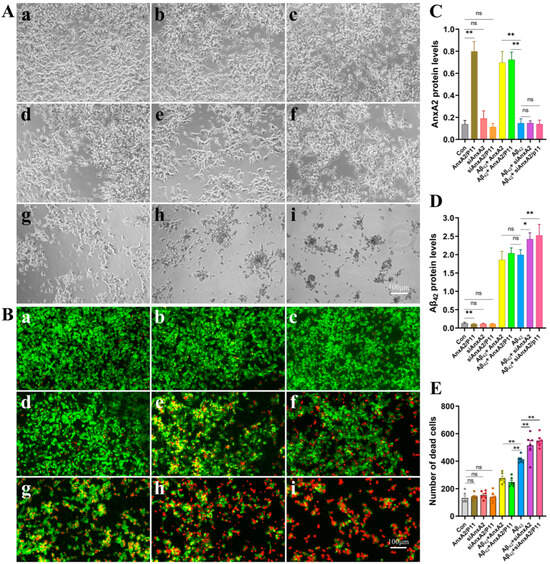 Protective effects of siAnxA2/P11 on SH-SY5Y cells. (A) The morphology of SH-SY5Y cells secreting Aβ42. Round-shaped cells with a bright edge are dying or dead. (B) Damaged cells were detected using ethidium bromide, a nucleic acid tracer that cannot pass through an intact cell membrane. (C) Expression levels of AnxA2 protein in different cell groups. (D) Expression levels of Aβ42 protein in different cell groups. (E) Quantification of cell damage using the Image J software (version 1.54). Results are expressed as means ± SEM. * p < 0.05, ** p < 0.01, ns, not significant, analyzed by one-way ANOVA, followed by the Tukey–Kramer test for multiple comparisons, n = 6. In (A,B): (a) Growth of SH-SY5Y cells treated with control medium (Con). (b) Growth of SH-SY5Y cells overexpressing AnxA2/P11. (c) Growth of SH-SY5Y cells treated with siAnxA2. (d) Growth of SH-SY5Y cells treated with siAnxA2/P11. (e) Growth of Aβ42-secreting and AnxA2-overexpressing SH-SY5Y cells. (f) Growth of Aβ42-secreting and AnxA2/P11-overexpressing SH-SY5Y cells. (g) Growth of SH-SY5Y cells secreting Aβ42. (h) Growth of Aβ42-secreting SH-SY5Y cells treated with siAnxA2. (i) Growth of Aβ42-secreting SH-SY5Y cells treated with siAnxA2/P11.
