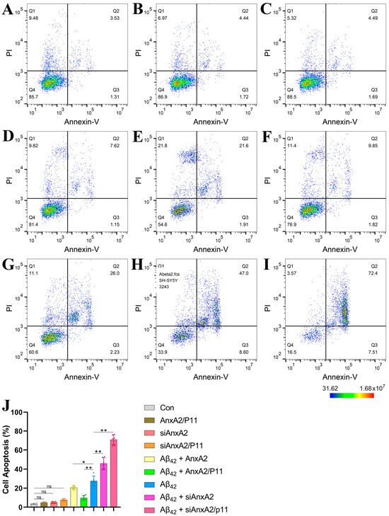 Flow cytometry analysis of the effects of siAnxA2/P11 on cell apoptosis. (A) Apoptosis in SH-SY5Y cells treated with control medium (Con). (B) Apoptosis in SH-SY5Y cells overexpressing AnxA2/P11. (C) Apoptosis in siAnxA2-treated SH-SY5Y cells. (D) Apoptosis in siAnxA2/P11-treated SH-SY5Y cells. (E) Apoptosis in Aβ42-secreting SH-SY5Y cells overexpressing AnxA2. (F) Apoptosis in Aβ42-secreting SH-SY5Y cells overexpressing AnxA2/P11. (G) Apoptosis in SH-SY5Y cells secreting Aβ42. (H) Apoptosis in Aβ42-secreting SH-SY5Y cells treated with siAnxA2. (I) Apoptosis in Aβ42-secreting SH-SY5Y cells treated with siAnxA2/P11. (J) Quantification of apoptosis in the SH-SY5Y cells using FlowJo (version 10.10). In figure (A) to (I), the color represents cell density. In figure (J), the results are expressed as mean ± SEM. * p < 0.05, ** p < 0.01, ns, not significant, analyzed by one-way ANOVA, followed by the Tukey–Kramer test for multiple comparisons, n = 6.