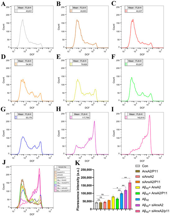 Effects of siAnxA2/P11 on ROS levels in SH-SY5Y cells secreting Aβ42. (A) ROS in wild-type SH-SY5Y cells (control). (B) ROS produced in SH-SY5Y cells overexpressing AnxA2/P11. (C) ROS levels in siAnxA2-treated SH-SY5Y cells. (D) ROS levels in siAnxA2/P11-treated SH-SY5Y cells. (E) ROS levels in Aβ42-secreting SH-SY5Y cells overexpressing AnxA2. (F) ROS levels in Aβ42-secreting SH-SY5Y cells overexpressing AnxA2/P11. (G) ROS levels in Aβ42-secreting SH-SY5Y cells. (H) ROS levels in Aβ42-secreting SH-SY5Y cells treated with siAnxA2. (I) ROS levels in Aβ42-secreting SH-SY5Y cells treated with siAnxA2/P11. (J) The overlay of flow cytometry charts is shown in the figure (A–I). (K) Quantification of the ROS levels using FlowJoTM. Results are expressed as mean ± SEM. * p < 0.05, ** p < 0.01, ns, not significant, analyzed by one-way ANOVA, followed by the Tukey–Kramer test for multiple comparisons, n = 6.