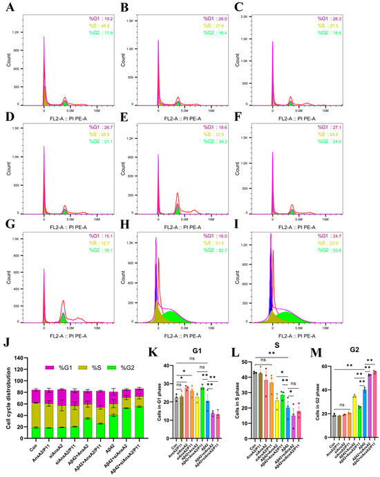 Effects of AnxA2 on cell cycle of SH-SY5Y cells secreting Aβ42. (A) Cell cycle of untreated SH-SY5Y cells (Con); (B) Cell cycle of SH-SY5Y cells overexpressingAnxA2/P11; (C) Cell cycle of siAnxA2-treated SH-SY5Y cells; (D) Cell cycle of siAnxA2/P11-treated SH-SY5Y cells; (E) Cell cycle of Aβ42-secreting SH-SY5Y cells overexpressing AnxA2; (F) Cell cycle of Aβ42-secreting SH-SY5Y cells overexpressing AnxA2/P11; (G) Cell cycle of non-treated Aβ42-secreting SH-SY5Y cells; (H) Cell cycle of Aβ42-secreting SH-SY5Y cells treated with siAnxA2; (I) Cell cycle of Aβ42-secreting SH-SY5Y cells treated with siAnxA2/P11; (J) Quantitation of the distribution of different phases of cell cycle including G1 (K), S (L), and G2 (M) phases. Data are presented as mean ± SEM. * p < 0.05, ** p < 0.01, ns, not significant, determined by one-way ANOVA followed by Tukey–Kramer test for multiple comparisons test, n = 3.