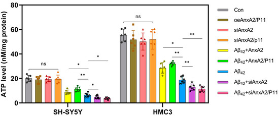 Effects of AnxA2 on intracellular ATP concentration in SH-SY5Y cells and HMC3 cells. Data are presented as mean ± SEM. * p < 0.05, ** p < 0.01, ns, not significant, determined by one-way ANOVA followed by Tukey–Kramer test for multiple comparisons, n = 6, oeAnxA2/P11: overexpression of AnxA2/P11, si: siRNA.