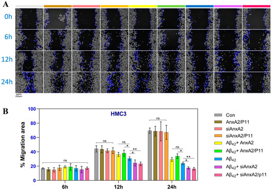 Effects of AnxA2 on HMC3 cell migration. (A) Microscopic images of cells at 0 h, 6 h, 12 h, and 24 h after scratching; (B) Statistical analysis of cell migration using the ImageJ software. Data are presented as mean ± SEM. * p < 0.05, ** p < 0.01, ns, not significant, analyzed by one-way ANOVA, followed by Tukey–Kramer test for multiple comparisons, n = 6.