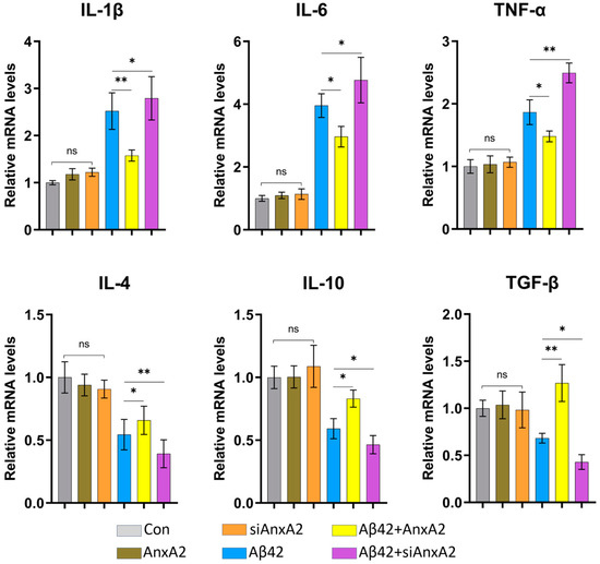 Effects of AnxA2 on mRNA levels of pro- and anti-inflammatory cytokines in SH-SY5Y cells. Proinflammatory cytokines include IL-1β, IL-6, and TNF-α, and anti-inflammatory cytokines include IL-4, IL-10, and TGF-β. Data are presented as mean ± SEM. * p < 0.05, ** p < 0.01, ns, not significant, determined by one-way ANOVA, followed by the Tukey–Kramer test for multiple comparisons, n = 4.