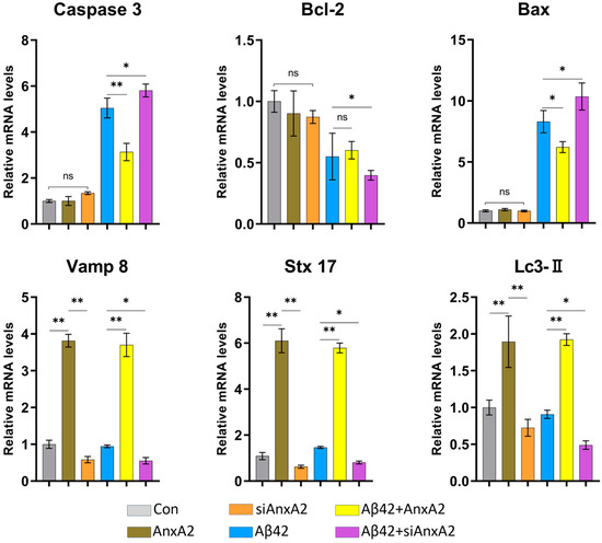 The transcription levels of key apoptotic and autophagy-related proteins were detected in six groups using qRT-PCR (Figure 12). These proteins include Caspase-3, the main terminal shearing enzyme in apoptosis, Bcl-2, an apoptosis inhibitor, Bax, a pro-apoptotic protein, and the autophagy-related proteins, Vamp8, Stx-17, and Lc3-II. The results showed that in the Aβ42 + AnxA2 group, the mRNA levels of Caspase-3 and Bax were significantly lower (p < 0.05) compared to Aβ42-secreting cells, while the mRNA level of Bcl-2 was not significantly different. Conversely, in the Aβ42 + siAnxA2 group, the mRNA levels of Caspase-3 and Bax were significantly higher (p < 0.05), and the mRNA levels of Bcl-2 were significantly lower (p < 0.05) compared to Aβ42-secreting cells. There were no significant differences in the mRNA levels of Caspase-3, Bcl-2, and Bax among the Con, AnxA2, and siAnxA2 groups. These data indicate that overexpression of AnxA2 in SH-SY5Y cells can alleviate apoptosis induced by secreted Aβ42, while the absence of AnxA2 exacerbates apoptosis.