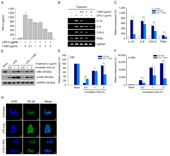 Anti-inflammatory effect of 7-MSI. (A) Raw 264.7 cells were exposed to varying concentrations of 7-MSI (0-4 μg/mL) in the presence of LPS (1 μg/mL) for 1 h. TNF-α levels in the culture supernatants were quantified using a specific ELISA kit for TNF-α and were compared to a standard curve for accuracy. (B) Raw 264.7 cells were exposed to 7-MSI at concentrations of 0.5, 1, and 2 μg/mL, alongside LPS at 1 μg/mL, for a duration of 3 h. Total RNA was extracted, and RT-qPCR was performed using primers that specifically target IL-1β, IL-6, COX-2, and PGEs. (C) The histograms display the relative expression rates of IL-1β, IL-6, COX-2, and PGEs, calculated as the ratio of signal intensity to GAPDH. (D) RAW 264.7 cells were exposed to 7-MSI (1 μg/mL) alongside LPS (1 μg/mL) for durations of 0.5, 1, and 3 h. Protein expression levels of IκBα, p-IκBα, and GAPDH were assessed through Western blotting. (E,F) The histograms illustrate the relative expression rates of IκBα and p-IκBα, normalized to the signal intensity of GAPDH. The data represent mean ± SD from triplicate Western blot experiments. Statistical significance was analyzed using Student’s t-test with the following significance levels: * p < 0.00001; ** p < 0.00005; *** p < 0.0001; ǂ p < 0.0005; ǂǂ p < 0.001; † p < 0.05, compared to the “LPS only” group. (G) Cells were treated with LPS (1 μg/mL) alone for 1 h or in combination with 7-MSI (1 μg/mL) for 1 h, and then stained with a fluorescein-conjugated antibody targeting NF-κB p65. The green fluorescence was subsequently observed using a confocal microscope.