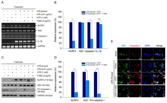 Raw 264.7 or RAW-ASC cells (1.0 × 105 cells) were seeded on poly-L-lysine (0.01% solution)-coated glass coverslips in 12-well plates and cultured at 37 °C in 5% CO2. After 24 h, Raw 264.7 cells were treated with LPS (1 μg/mL) and 7-MSI (1 μg/mL) for 1 h, while RAW-ASC cells were primed with LPS (0.01 μg/mL) for 3 h followed by treatment with 7-MSI (2 μg/mL) and ATP (1 mM) for an additional 3 h. The cells were then washed with 0.01 M pH 7.4 phosphate-buffered saline (PBS) and fixed with 3.7% formaldehyde in PBS for 10 min at room temperature. After fixation, the cells were permeabilized with 0.1% Triton X-100 for 10 min and washed three times with PBS. Blocking was performed with 1% bovine serum albumin (BSA) in PBS at room temperature for 20 min. The cells were then incubated with anti-MAP LC3-II, anti-NF-κB p65, anti-ASC, or anti-Caspase-1 antibodies (1:50 in PBS; Santa Cruz Biotechnology, Dallas, TX, USA) for 1 h at room temperature. Following primary antibody incubation, the cells were washed three times with PBS and incubated with Alexa Fluor 488-conjugated goat anti-mouse IgG (1:200 in PBS; Invitrogen, Waltham, MA, USA) or goat anti-rabbit IgG-TRITC (1:200 in PBS; Santa Cruz Biotechnology, Dallas, TX, USA) secondary antibodies for 1 h at room temperature. After being washed three times with PBS, the cells were stained with 4′,6-diamidino-2-phenylindole (DAPI). The stained cells were than observed under a Zeiss LSM 510 confocal microscope (Le Pecq, France).