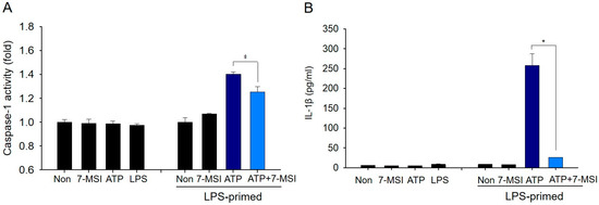RAW-ASC cells were seeded at a density of 2 × 105 cells/well in 6-well plates and cultured overnight. The cells were primed with LPS (0.01 μg/mL) for 3 h, followed by treatment with 7-MSI (2 μg/mL) and ATP (1 mM) for an additional 3 h at 37 °C in 5% CO2. Caspase-1 activity was assessed using a fluorometric caspase-1 assay kit (Abcam, Cambridge, UK) according to the manufacturer’s instructions. Briefly, the treated cells were washed with cold PBS and resuspended in 50 μL of cell lysis buffer, followed by incubation on ice for 10 min. The cell lysates were then centrifuged at 16,000× g for 4 min at 4 °C, and the supernatants were collected. Equal volumes (50 μL) of the samples and 2× reaction buffer (containing 10 mM dithiothreitol) were mixed, and 50 μM of YVAD-AFC substrate was added. After incubating at 37 °C for 1 h, fluorescence intensity was measured using a microplate reader (Molecular Devices) at excitation and emission wavelengths of 400 nm and 505 nm, respectively.