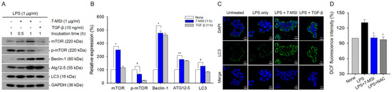 Treatment with 7-MSI (1 µg/mL) in the presence of LPS (1 μg/mL) increased the expression levels of autophagy-associated proteins Beclin-1, LC3, and Atg12 by approximately 377%, 27%, and 77%, respectively, while decreasing phospho-mTOR levels by approximately 34% compared to LPS stimulation alone (Figure 5A,B). Immunostaining with anti-LC3II antibody confirmed the formation of autophagosomes in 7-MSI-treated cells (Figure 5C). As shown in Figure 5D, LPS increased ROS production up to 130.67%, compared to that of non-irradiated control. However, the levels of ROS production could be decreased by 7-MSI and NAC treatments to approximately 29.74% and 33.31%, respectively, compared to that of the LPS only group. These results suggest that 7-MSI reduced LPS-induced ROS production by approximately 29.74% compared to the LPS only group (Figure 5D), suggesting enhanced autophagic activity (Figure 5A–C) and reduced oxidative stress (Figure 5D).