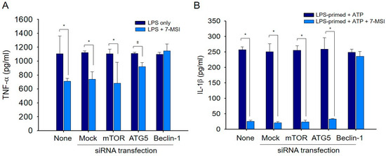 Finally, we investigated the relationship between the activation of the autophagy system and the inhibition of inflammasome formation by 7-MSI using RNA interference experiments. The ELISA results of RAW-ASC cells treated with LPS (0.01 μg/mL) and 7-MSI (2 μg/mL) showed a 26% decrease in the production of TNF-α. However, in cells transfected with Beclin-1 siRNA, the production level increased by the same amount as in the group not treated with 7-MSI (Figure 6A). In addition, the analysis of IL-1β secretion, produced by NRLP3 activation, through ELISA revealed that the secretion of IL-1β decreased by 92.02% due to 7-MSI treatment. However, in cells transfected with Beclin-1 siRNA, the secretion increased almost equivalently to the group not treated with 7-MSI (Figure 6B).