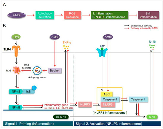 Schematic summary of 7-MSI on anti-inflammation and autophagy activation. (A) summarizes the effect of 7-MSI on autophagy and reactive oxygen species (ROS) clearance. 7-MSI activates autophagy and reduces ROS, which in turn can lead to general inflammation or specifically trigger the NLRP3 inflammasome, contributing to skin inflammation. (B) illustrates the molecular pathways influenced by LPS through TLR4, highlighting how 7-MSI intersects with these pathways. In the priming stage, the expression of NLRP3 and pro-IL-1β is increased, while the activation stage involves the formation of the ASC and caspase-1 complex, leading to the production of active caspase-1 and IL-1β. 7-MSI modulates these pathways at various points, potentially reducing the inflammatory response by inhibiting the activation of key inflammatory mediators.