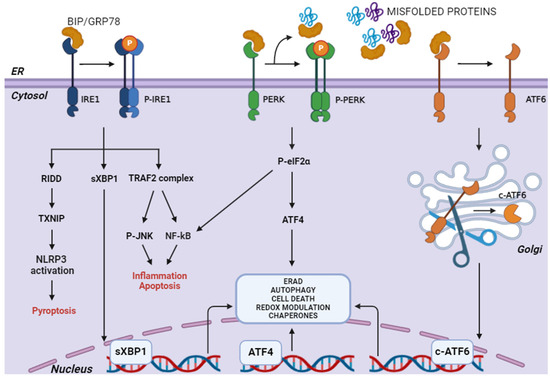Hyperactivation of IRE1 can also lead to other types of cell death other than apoptosis; in fact, this transducer is also involved in the activation of TXNIP. Its mRNA is normally not translated due to the presence of a microRNA that regulates its expression, namely miR-17. Under prolonged ER stress, the RNase activity of IRE1 towards the pre-mRNA of XBP1 becomes less specific, resulting in a process of multiple mRNA degradation, called RIDD (regulated IRE1-dependent decay). Thus, IRE1 increases the stability of TXNIP mRNA to be translated into protein, while reducing the levels of miR-17, which is degraded by RIDD. In turn, the elevated TXNIP protein activates the NLRP3 inflammasome, resulting in the production of inflammatory cytokines, such as interleukin 1β (IL-1β), which underlies pyroptosis [62]. Thus, in the presence of ER stress, the activation of IRE1 would play a critical role in the initiation of pro-death signals, whereas the activation of PERK and ATF6 would appear to precede the activation of IRE1 to resolve the stress with a pro-survival action. If stress persists, the PERK and IRE1 pathways may converge, mediating the induction of different types of cell death through mutual potentiation (Figure 2).
