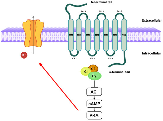 Stimulation of CB1 and CB2 receptors leads to the inhibition of AC activity and, therefore, to the decrease in cyclic adenosine monophosphate (cAMP) levels [106]. This, in turn, results in a downregulation of protein kinase A (PKA) activity [107], leading to the activation of voltage-dependent potassium channels. K+ efflux produces hyperpolarization modulating both postsynaptic and presynaptic neurons’ activities (Figure 3) [108].