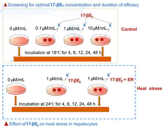 Hepatocytes (2.5 × 105/well) were cultivated within both 12-well culture plates and 96-well microtiter plates under 18 °C in an incubator with 5% CO2. After establishing a dense monolayer of hepatocytes, the cells were divided into four groups and treated with 0, 0.1, 1, or 10 μM/mL of 17-βE2 (prepared at 10 mM/mL in DMSO) (Sigma Aldrich Co., St. Louis, MO, USA). Each group underwent incubation for periods of 4, 8, 12, 24, or 48 h, accordingly. Cells from three replicate wells of the same treatment were collected in a 5 mL sterilized centrifuge tube as one sample, and cell samples from 18 wells were collected to obtain six biological replicates. The optimal concentration of 17-βE2 for subsequent experiments was identified. A schematic representation of the experimental procedure is shown in Figure 1.