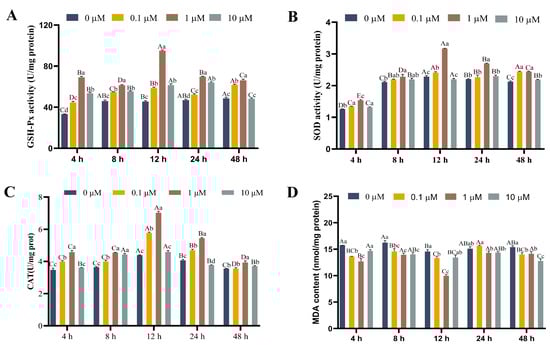Functions of 17-βE2 at varying concentrations in GSH-Px (A), SOD (B), CAT activities (C) (U/mg protein), and MDA level (D) (nmol/mg protein) of rainbow trout primary hepatocytes. Data are represented by means ± SD (n = 6). Differences were analyzed using LSD and Duncan’s multiple-range test of one-way ANOVA. The lowercase stands for the difference among concentrations at one time point, while the capital indicates the identical 17-βE2 concentration between different time points. (A) Normal distribution p = 0.258, homogeneity of variance p = 0.442; (B) normal distribution p = 0.208, homogeneity of variance p = 0.171; (C) normal distribution p = 0.239, homogeneity of variance p = 0.082; (D) normal distribution p = 0.098, homogeneity of variance p = 0.724.