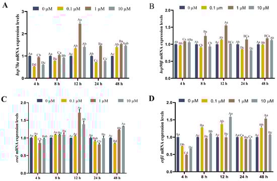 Function of 17-βE2 at varying concentrations in hsp70a (A), hsp90β (B), era1 (C), and erβ1 (D) expression over time in the absence of heat stress. Data represent means ± SD (n = 6). Differences were analyzed using LSD and Duncan’s multiple-range test of one-way ANOVA. The lowercase stands for the difference among concentrations at one time point, while the capital indicates the identical 17-βE2 concentration between different time points. (A) Normal distribution p = 0.891, homogeneity of variance p = 0.109; (B) normal distribution p = 0.156, homogeneity of variance p = 0.954; (C) normal distribution p = 1.000, homogeneity of variance p = 0.580; (D) normal distribution p = 0.513, homogeneity of variance p = 0.075.