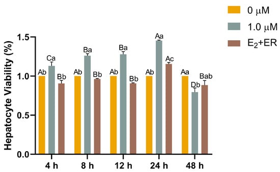 To investigate the impact of 17-βE2 on hepatocytes derived from rainbow trout, various concentrations of 17-βE2 were introduced to the in vitro cultured hepatocytes. The findings indicated that in the 0.1 µM/mL and 10 µM/mL 17-βE2 concentration-treated groups, hepatocyte viability was not significantly changed due to prolonged incubation time compared to the control group. At the 1.0 µM optimal dose, cell viability exhibited an initial increase followed by a decline. After a 12 h incubation period, cell viability notably increased (p < 0.05) compared with control and all the remaining treatment groups (Table 1). Moreover, the rise in hepatocyte viability over time for the 1.0 µM/mL group was recorded at increments of 14%, 27%, 77%, 48%, and 38% above that of the control group, respectively.