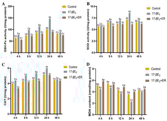 To analyze how 17-βE2 affected antioxidant enzymes within rainbow trout hepatocytes under heat stress, we classified cells into three groups, namely, the control group (culture medium), 17-βE2 group (1.0 μM optimal concentration), and 17-βE2 + ER group, and SOD, GSH-px, CAT activities, and the MDA contents within rainbow trout hepatocytes subjected to different treatments were assayed. As illustrated in Figure 6, GSH-px activity was significantly elevated during heat stress in the 17-βE2 group compared to the control group, showing increases of 20.1%, 33.3%, 30.6%, 46.4%, and 7.3% (p < 0.05) over time. Conversely, in the 17-βE2 + ER group, GSH-px activity decreased by 11.5% at 24 h of heat stress (Figure 6A). SOD activity exhibited increases of 4.45%, 5.55%, 12.14%, 20.70%, and 6.13% (p < 0.05) over time, while it decreased by 15.8% in the 17-βE2 + ER group at 24 h of heat stress (Figure 6B). CAT activity rose by 10.63%, 16.36%, 17.78%, 19.48%, and 2.32% (p < 0.05) but declined by 1.6% in the 17-βE2 + ER group at 24 h of heat stress (Figure 6C). In contrast, MDA content decreased progressively by 13.9%, 15.4%, 17.5%, 58.9%, and 8.7%, whereas in the 17-βE2 + ER group, MDA content increased with prolonged heat stress duration in comparison with the control group (Figure 6D).