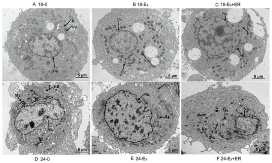 TEM images showing rainbow trout hepatocytes in the control group at 18 °C (A), 17-βE2 group at 18 °C (B), 17-βE2 + ER group at 18 °C (C), control group at 24 °C (D), 17-βE2 group at 24 °C (E), 17-βE2 + ER group at 24 °C (F). Nu, nucleus; Mi, mitochondrion; ER, endoplasmic reticulum. Scale bar: 5 μm.