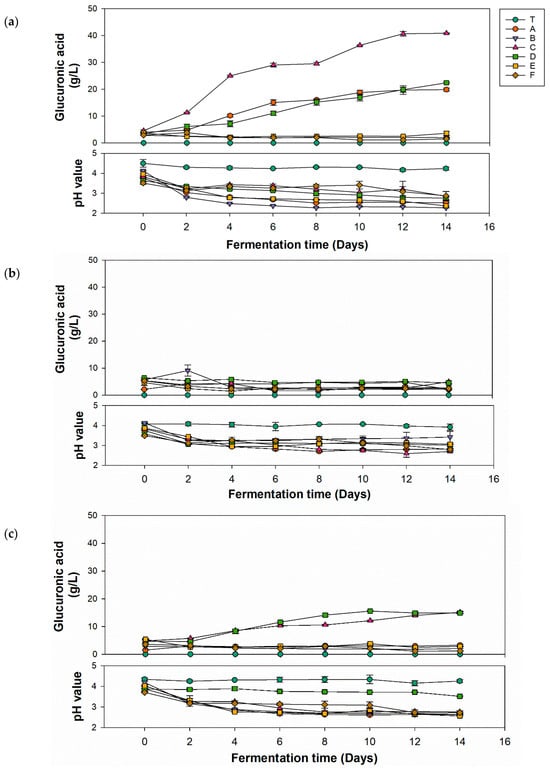 - Nguyen, N.K.; Nguyen, P.B.; Nguyen, H.T.; Le, P.H. Screening the optimal ratio of symbiosis between isolated yeast and acetic acid bacteria strain from traditional kombucha for high-level production of glucuronic acid. LWT-Food Sci. Technol. 2015, 64, 1149–1155. [Google Scholar] [CrossRef]