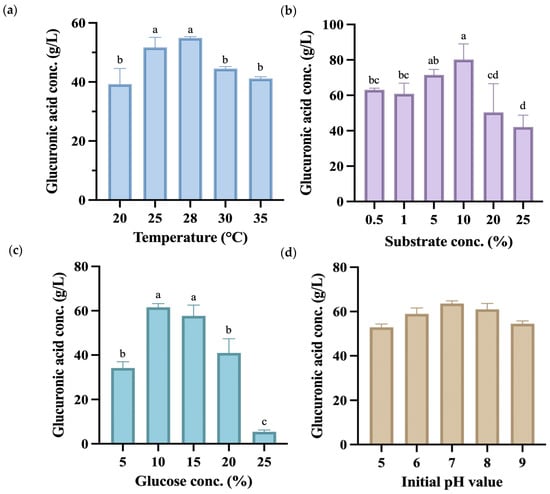 3.2. Optimal Single-Factor Fermentation Conditions for Gluconic Acid Production