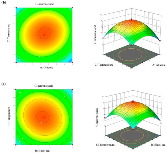 | Glucose (%, w/v) | Black Tea (%, w/v) | Temp. (°C) | Glucuronic Acid (g/L) | ||