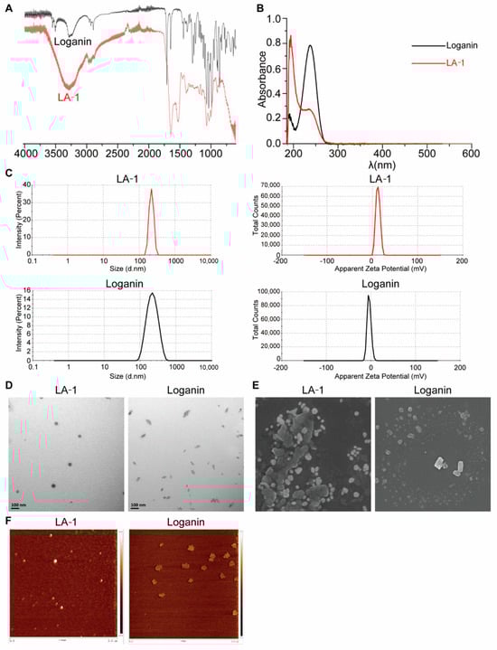 Characterization of LA−1 and loganin. (A) The FT−IR spectra of LA-1 and loganin. (B) The UV spectra of LA−1 and loganin. (C) Particle size distribution and zeta potential of LA−1 and loganin. (D) TEM images of LA−1 and loganin. (E) SEM images of LA−1 and loganin. (F) AFM images of e LA−1 and loganin.