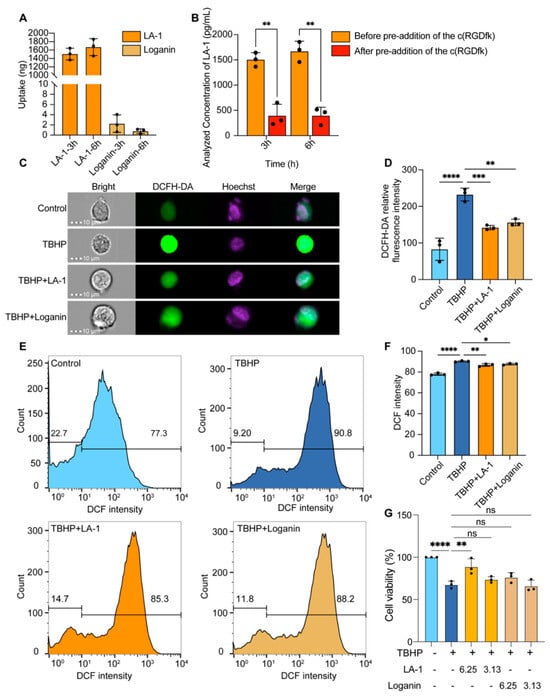 Evaluation of the neuroprotective and antioxidant effects of LA-1 and loganin. (A) Comparative Uptake of LA-1 and Loganin in BEnd.3 cells. (B) Drug of LA-1 uptake over time was measured by HPLC-MS after pre-addition of the αvβ3 inhibitor c(RGDfk). (C) Representative images of BEnd.3 cells stained with DCFH-DA (green) and Hoechst (purple) under different treatment groups. (D) Quantification of the percentage of DCFH-DA relative fluorescence intensity in each treatment group. (E) Flow cytometry analysis of DCFH-DA stained BEnd.3 cells to detect ROS levels under different treatment conditions. (F) Quantification of the percentage of DCFH-DA relative fluorescence intensity in each phase. (G) LA-1 and loganin’s protective effects against TBHP-induced cytotoxicity. Data were presented as mean ± SD, with statistical significance indicated as * p < 0.05, ** p < 0.01, and *** p < 0.001. **** p < 0.0001, ns represents not significant, n = 3.