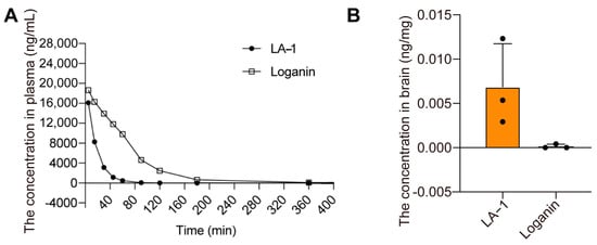 We purchased male Sprague-Dawley (SD) rats weighing between 200 and 220 g, which had been catheterized in the jugular vein, from Beijing Sinocon Pharmaceutical Technology Co., Ltd. (Beijing, China). The rats were divided into two groups: LA-1 group and loganin group, with three rats in each group. First, 200 μL of whole blood was collected from each rat at time point zero as a blank control. Subsequently, LA-1 and loganin were administered tail via injection at a dose of 30 mg/kg, dissolved in 0.9% saline. For the pharmacokinetics of the intravenously administered drugs, blood samples of 200 μL were collected from the rats at 5, 15, 30, 45 min, 1, 1.5, 2, 3, 6, 8, 12, and 24 h, using heparinized anticoagulation tubes for processing [29]. After each blood collection, 200 μL of perfusion solution was injected into the rats through the catheter to maintain their physiological status. To obtain the rat plasma, the samples were centrifuged immediately at 3500 rpm for 10 min (5810R) after collection. Methanol (300 μL) was added to plasma samples (100 μL) to precipitate plasma proteins, then rotary evaporation at 35 °C was used to remove methanol from the samples. The LA-1 and loganin were quantified by LC–MS/MS analysis (ACQUITY UPLC I-Class/Xevo TQ-XS, Waters, Milford, MA, USA).