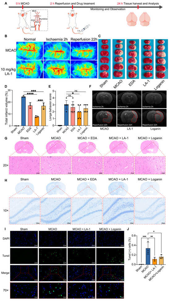Therapeutic effect of the LA-1 on a rat model of cerebral ischemia/reperfusion injury. (A) The experimental timeline for in vivo evaluation of LA-1 and loganin. (B) Non-invasive, trans-cranial laser Doppler perfusion imaging to verify occlusion at 2h,22h after MCAO. (C) Representative images of TTC-stained brain slices after treatment with LA-1 and loganin for 22 h in MCAO rat model. (D) Corresponding infarct size statistics. (E) Neurological scores of MCAO rats after treatment with LA-1 and loganin for 22 h. (F) MRI imaging of MCAO rats before and after the i.v. injection of the LA-1 and loganin. (G) H&E staining, scale bar = 50 μm. (H) Nissl staining, scale bar = 100 μm and (I) tunel staining, scale bar = 100 μm, scale bar = 20 μm of brain tissues from different treatment groups. (J) Recorded the number of tunel cells by image J. Data were presented as the mean ± SD, * p < 0.05, ** p < 0.01, and *** p < 0.001. **** p < 0.0001, ns represents not significan.
